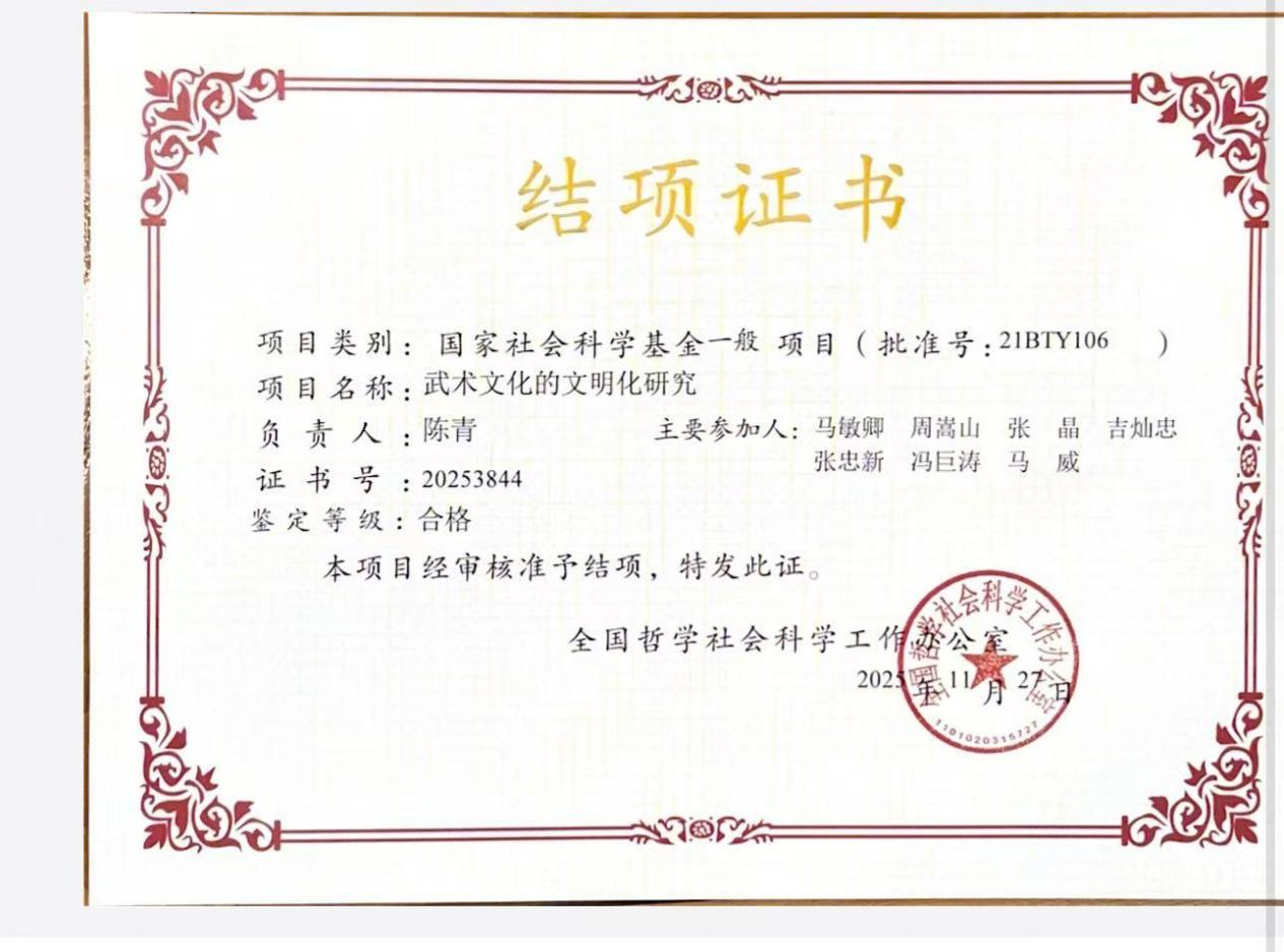 近日,全国哲学社会科学工作办公室公布了2025年国家社会科学基金项目结项结果,我院陈青教授主持的“武术文化的文明化研究”通过结项鉴定。